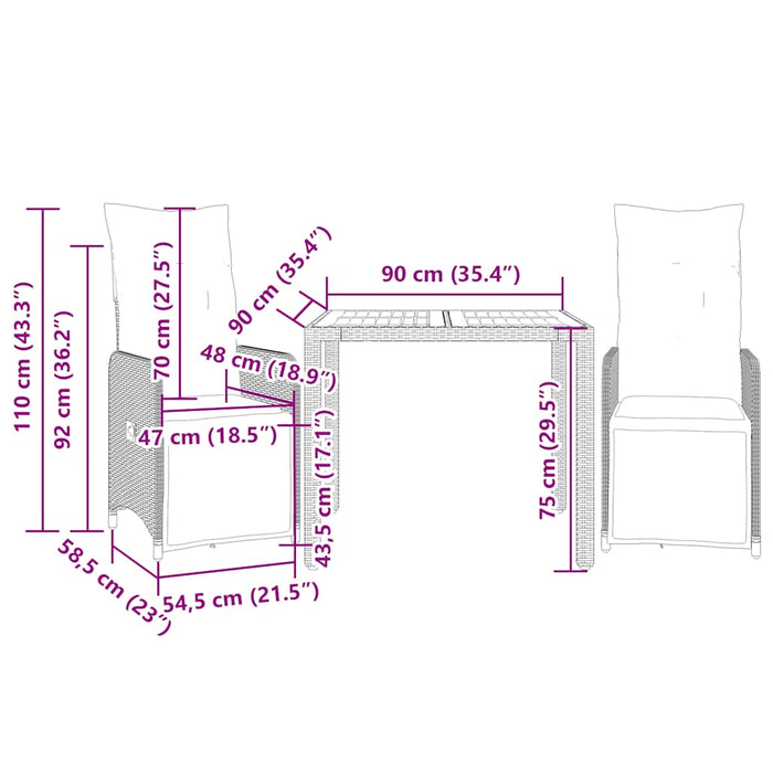 Set bistro de grădină cu perne, 3 piese, negru, poliratan